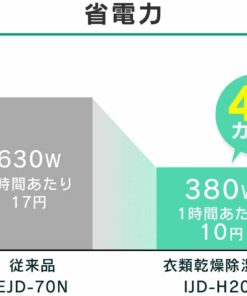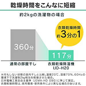 乾燥時間が約3分の1に自然乾燥の場合と比べ、衣類乾燥時間が約3分の1に短縮できる。 | 除湿機能デシカント式ヒーターを使ったパワフルな除湿で、衣類乾燥にぴったり。 寒い季節でも除湿能力が落ちないので、一年中使える。 | 静音で夜の部屋干しも安心静音34dbで、お子様の勉強や睡眠の妨げにならない。 |