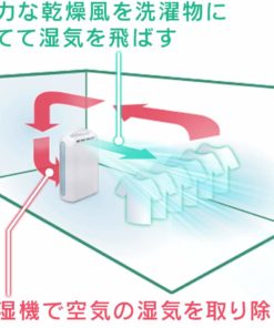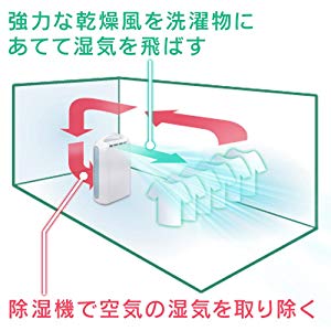 ◆部屋干しの効率が大幅UP 乾燥風を洗濯物にあてて湿気を飛ばし、除湿機で空気の湿気を取り除く。